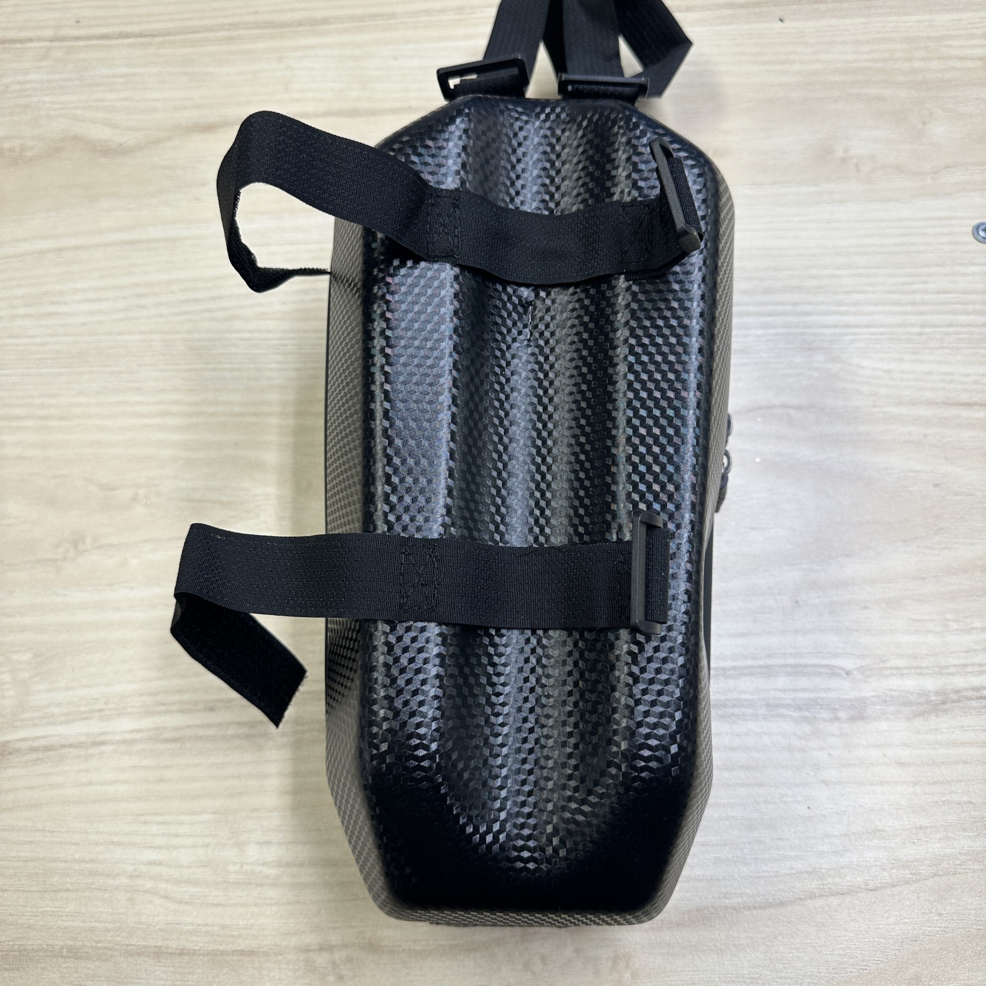 Väskan fästs med kardborreband (2st uppe och 2st längs med styrstången).